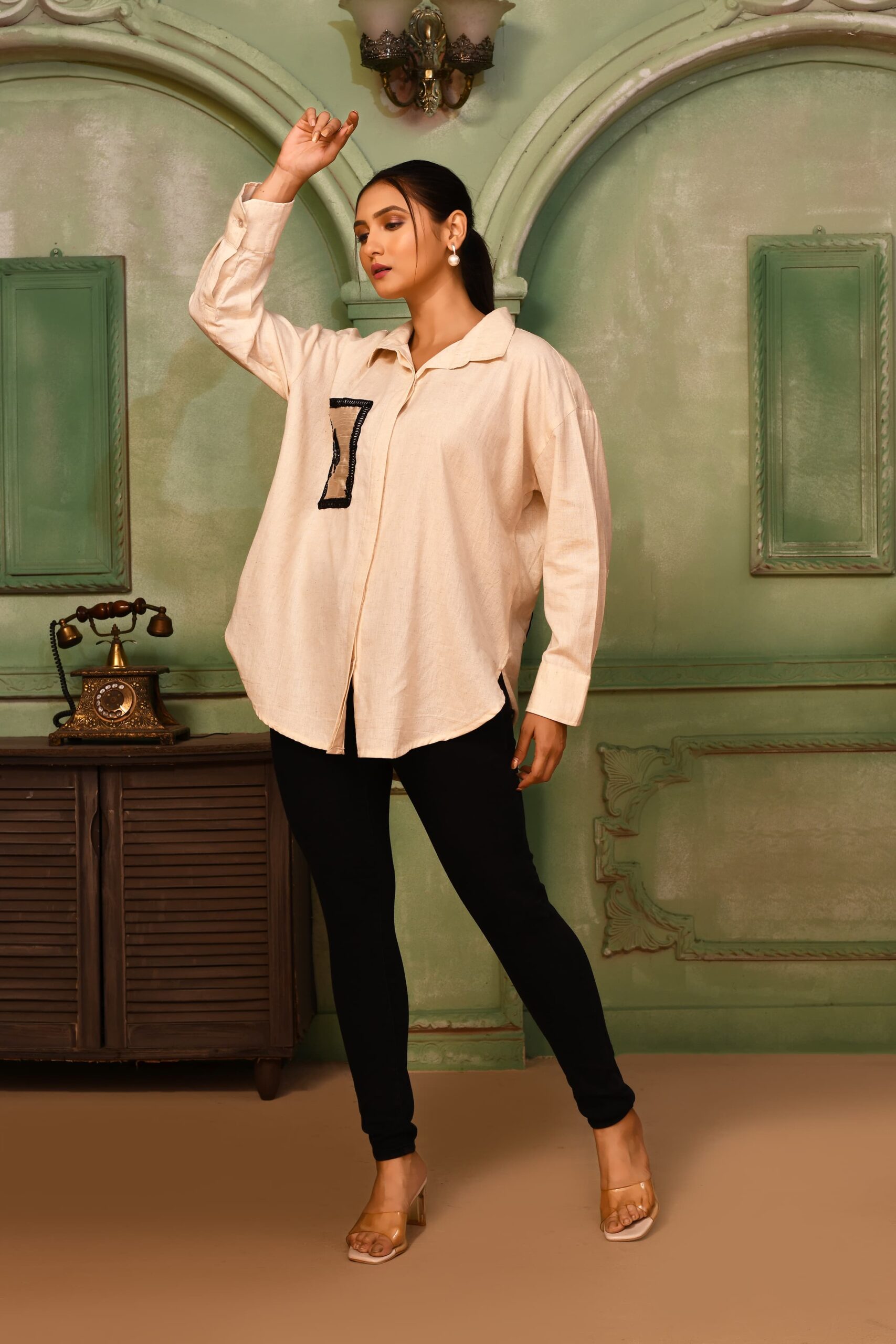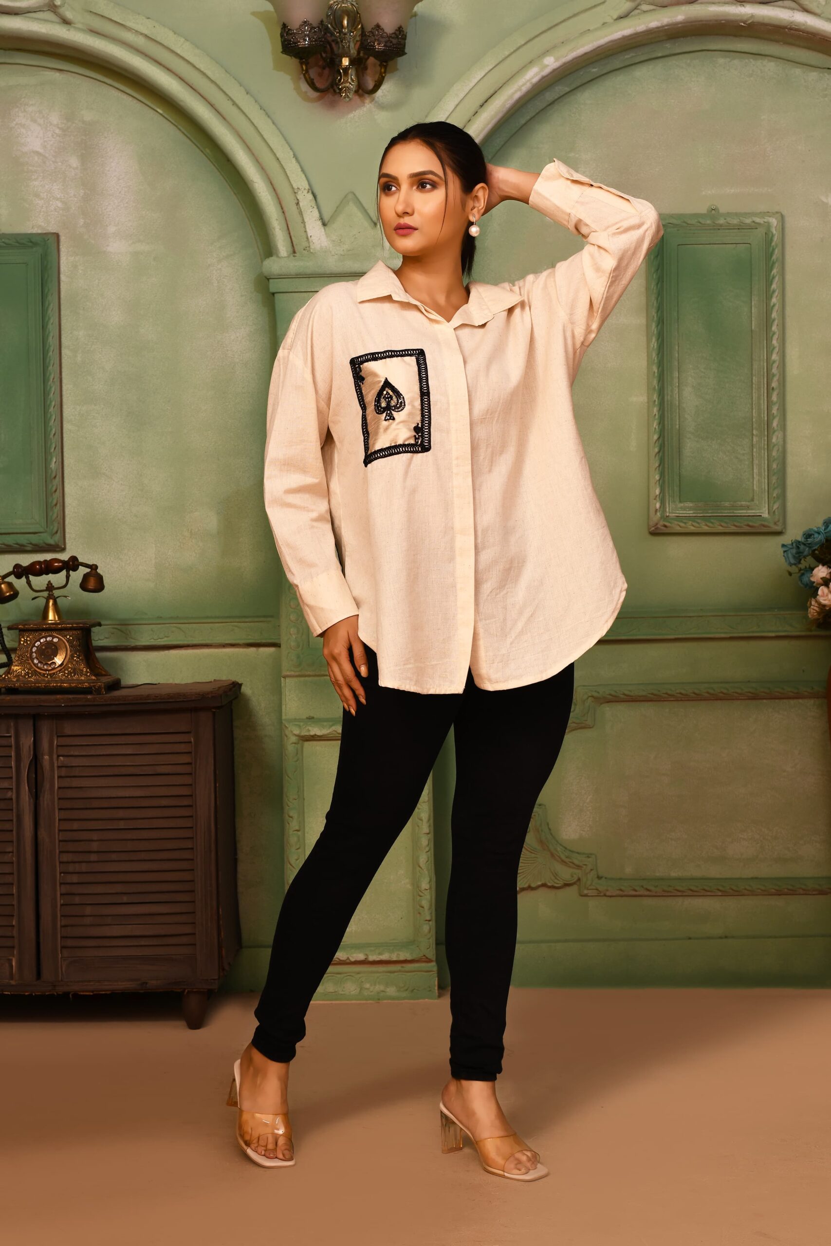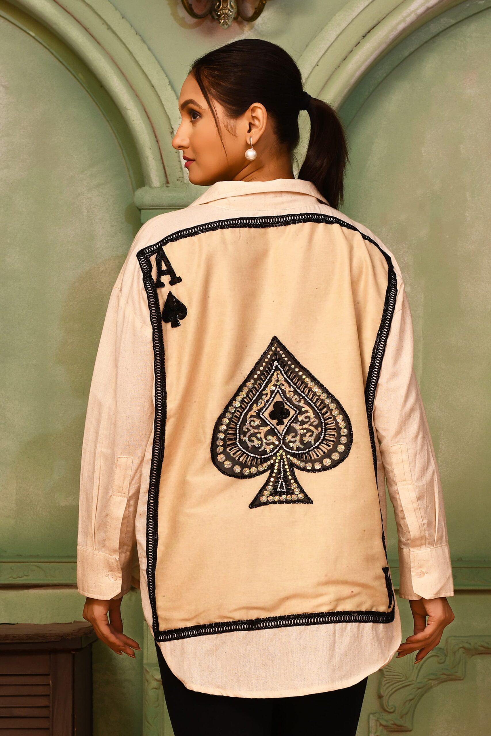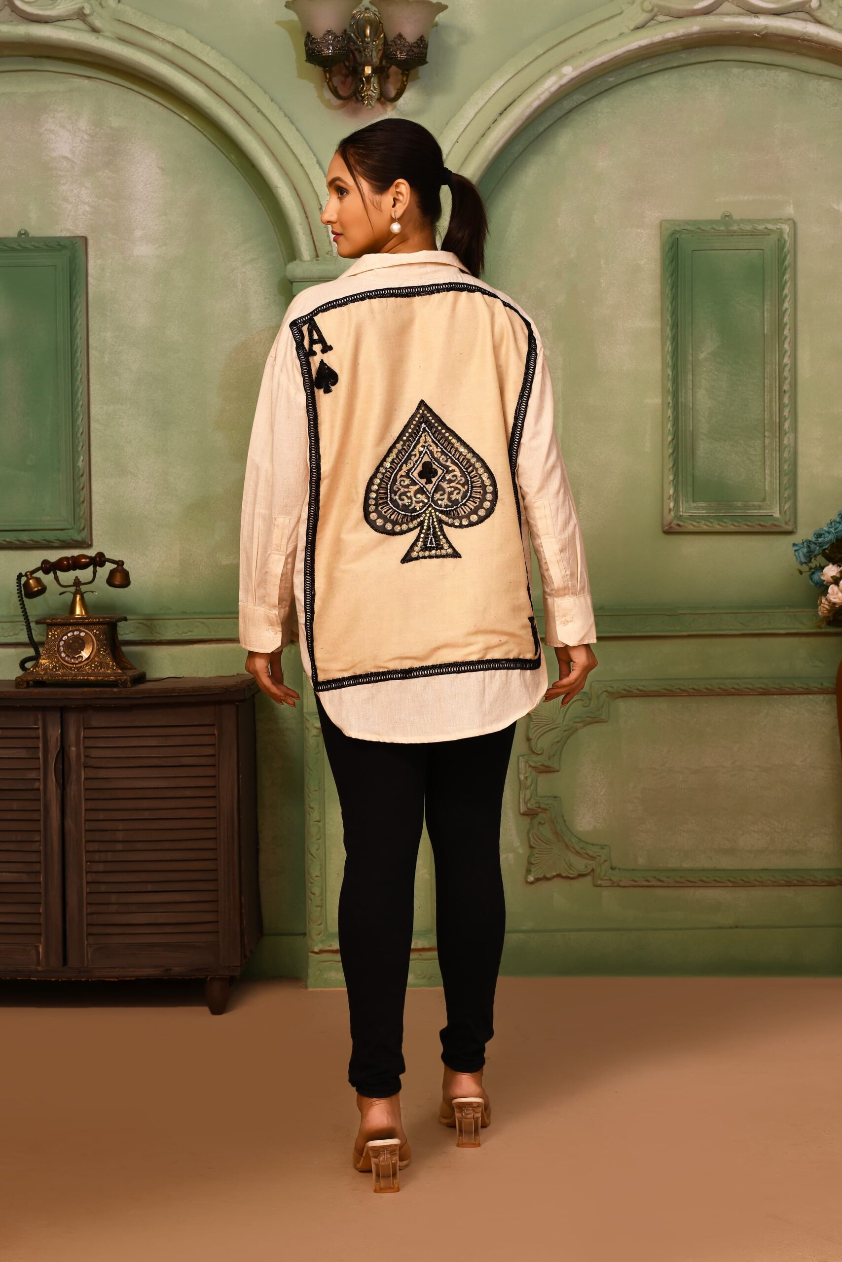 Cotton shirt with a hand printed, hand embroidered black sequins Ace for poker nights or to ace any event