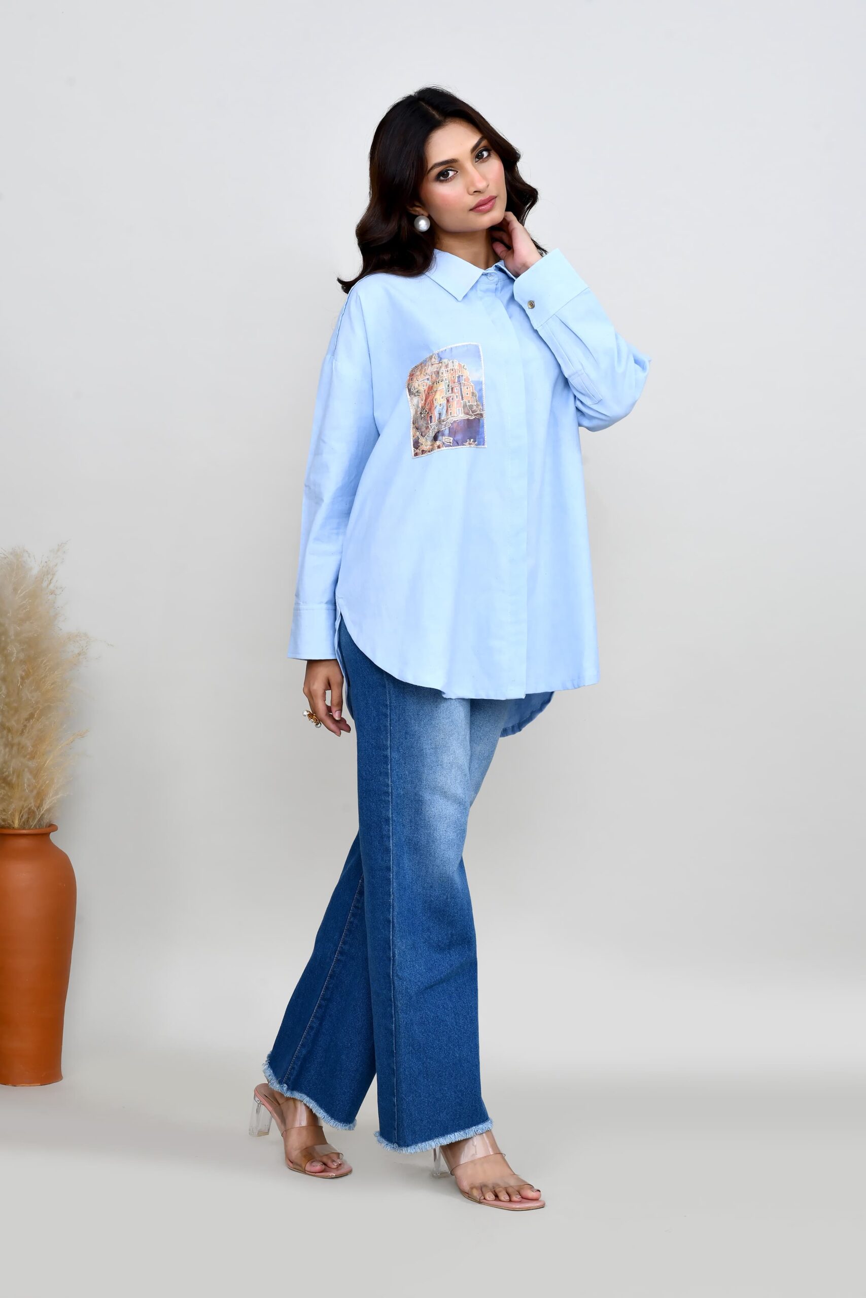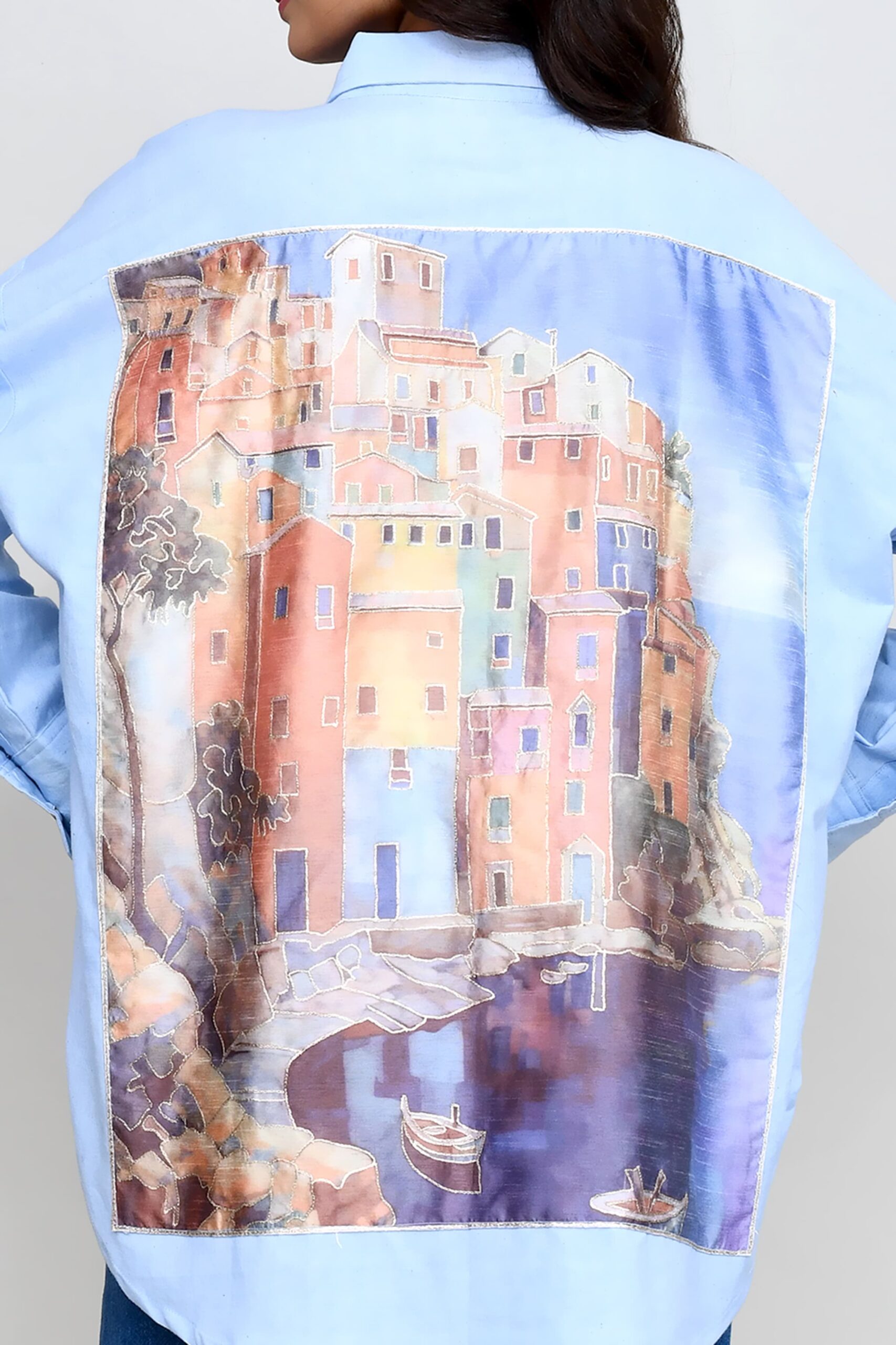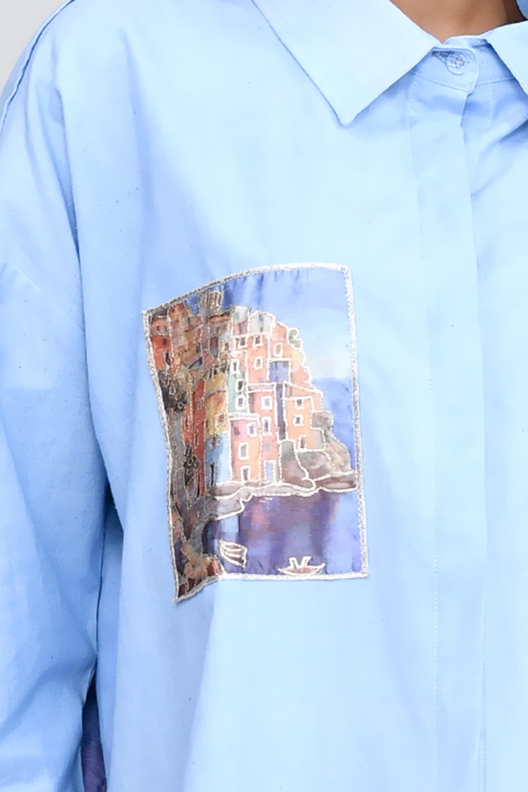 Cotton drop shoulder, Amalfi seacoast is outlined with gold peeta embroidery Color: Light blue Fabric: Cotton Antifit Size: Free Size