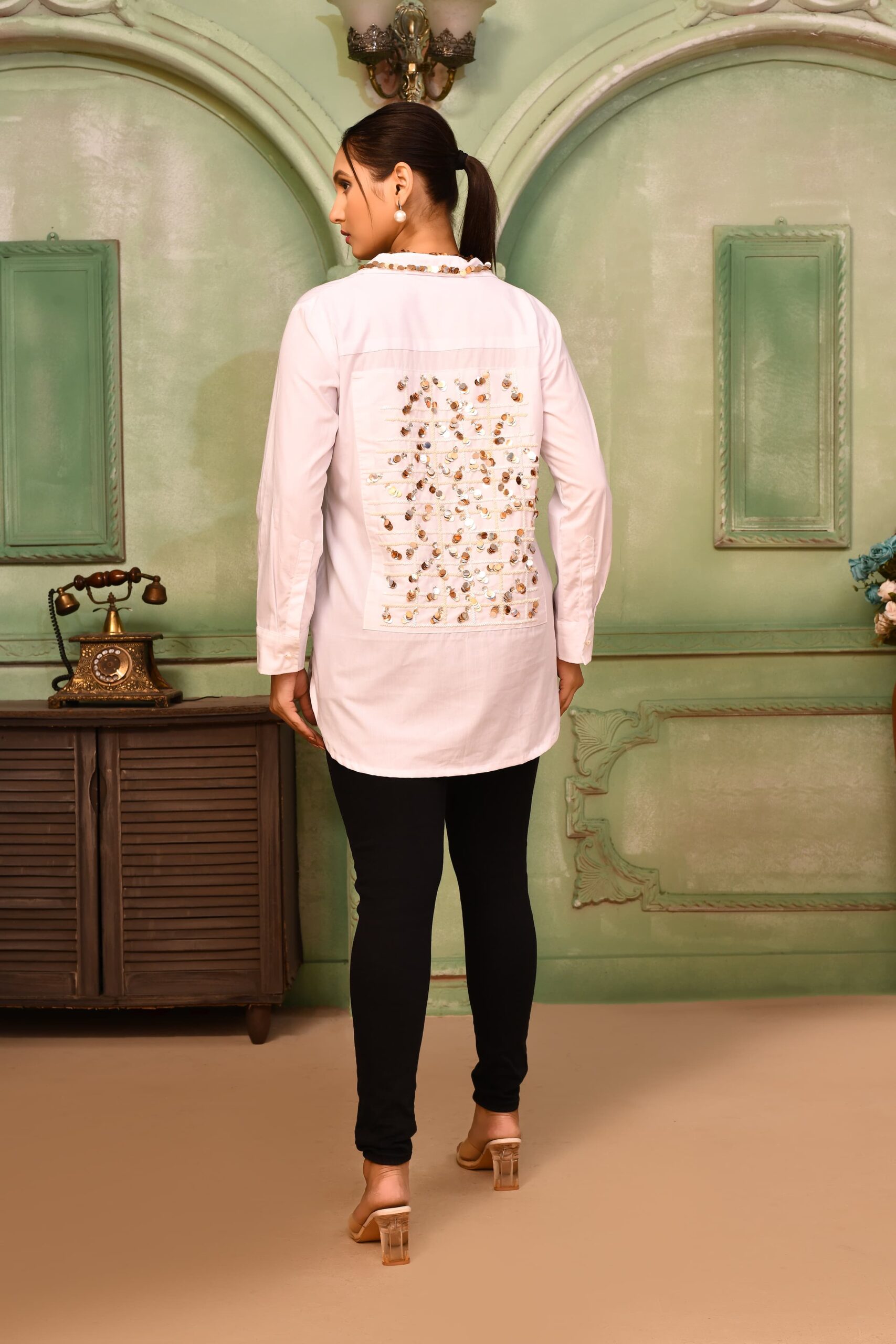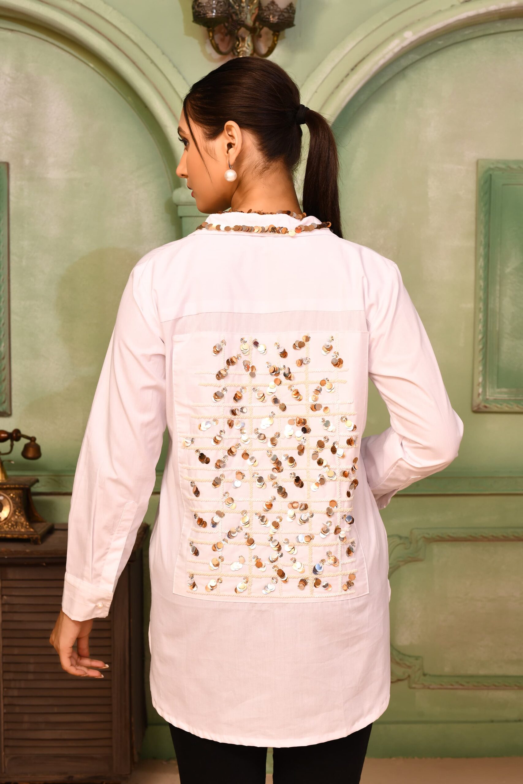Structured cotton shirt, hand embroidered with stones and large sequins