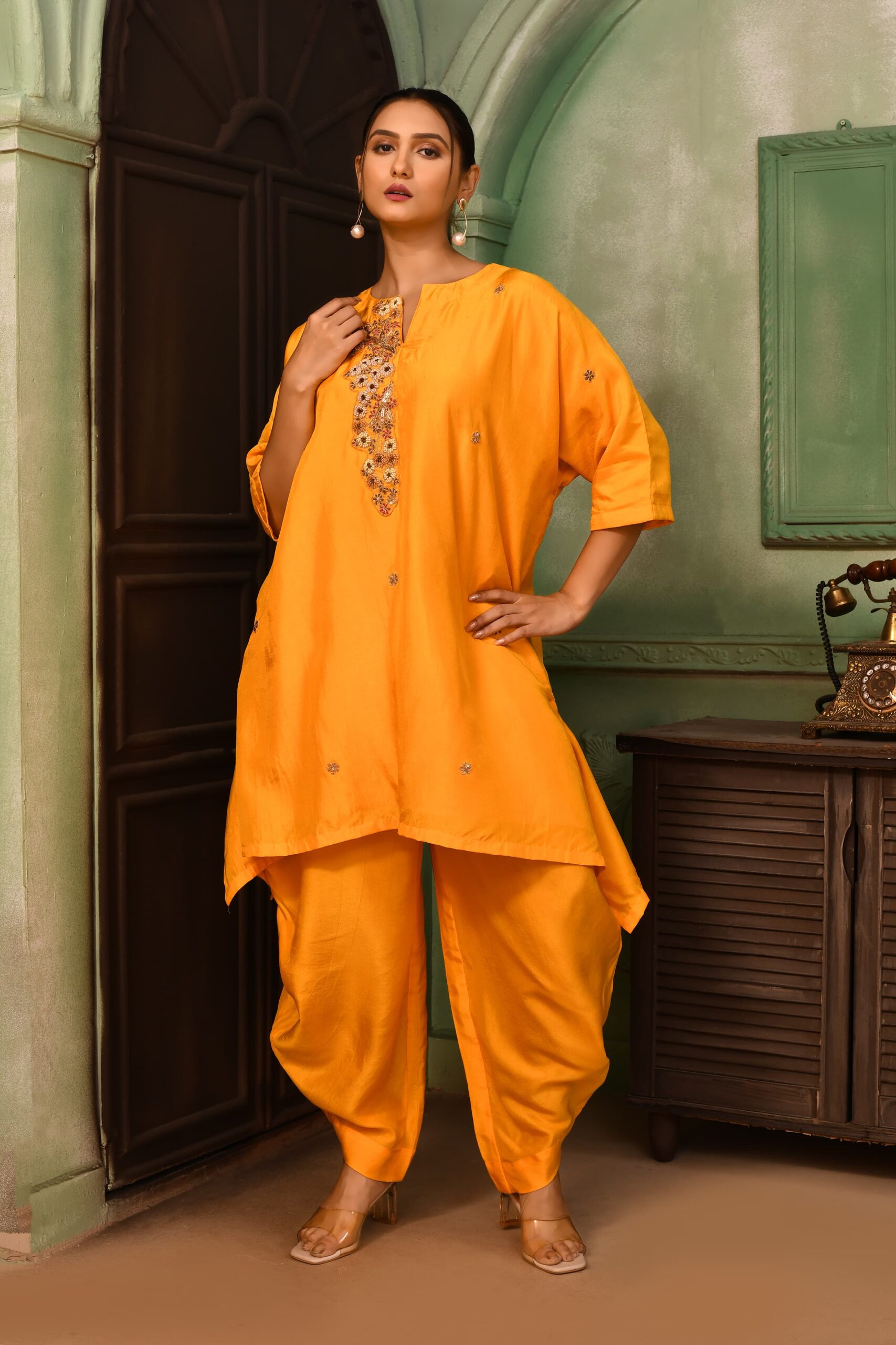 Exquisite french knots in pearls and sequins forming a cluster of flowers for the top. Draped harem pants to match
