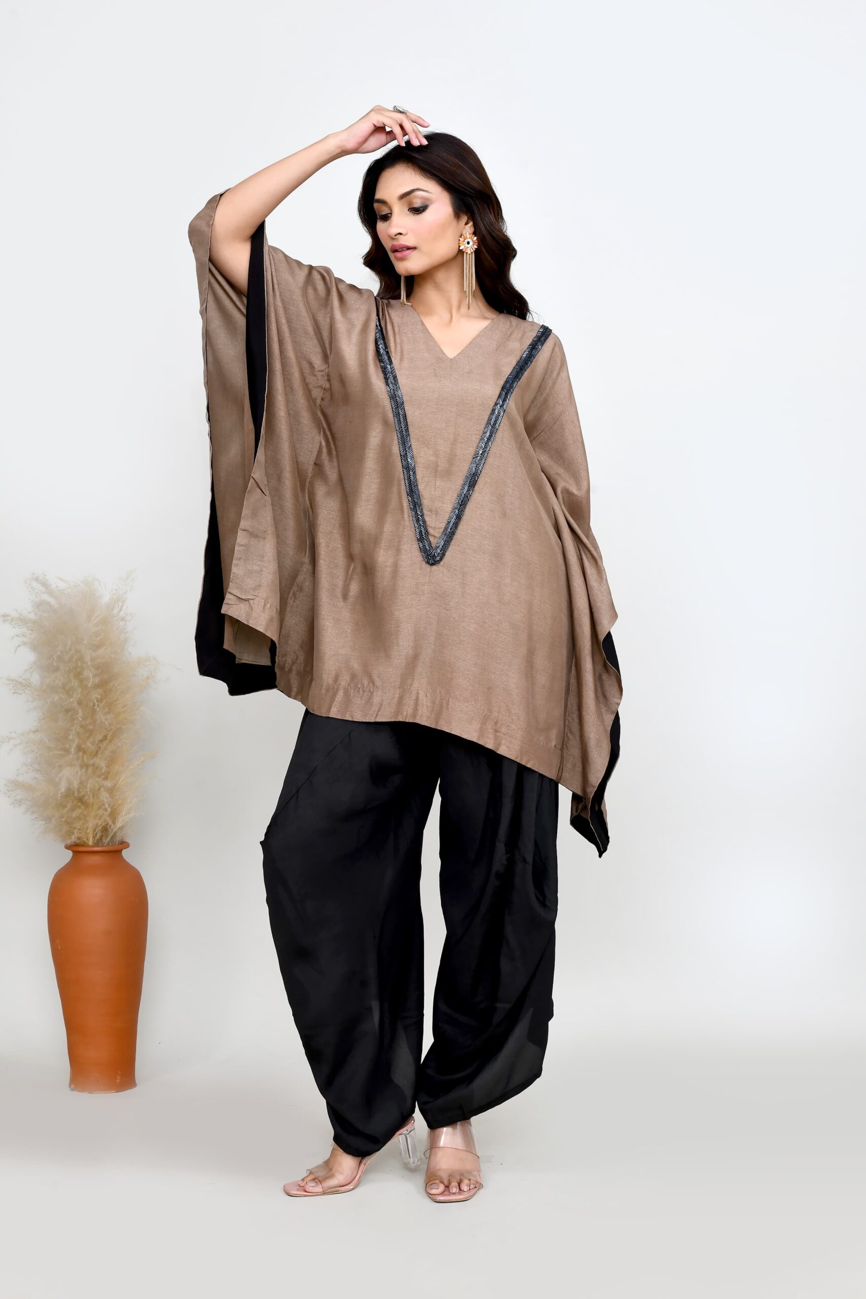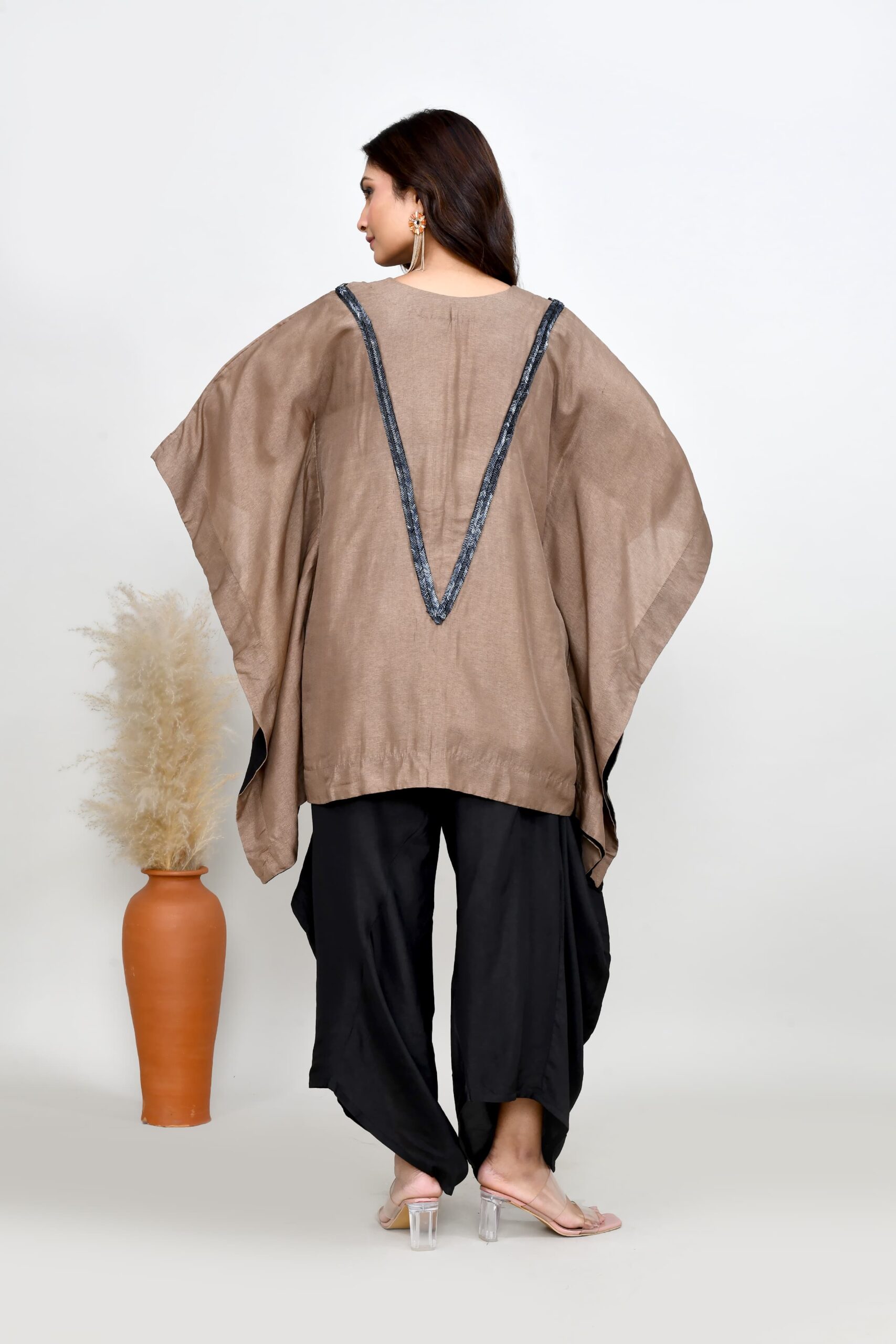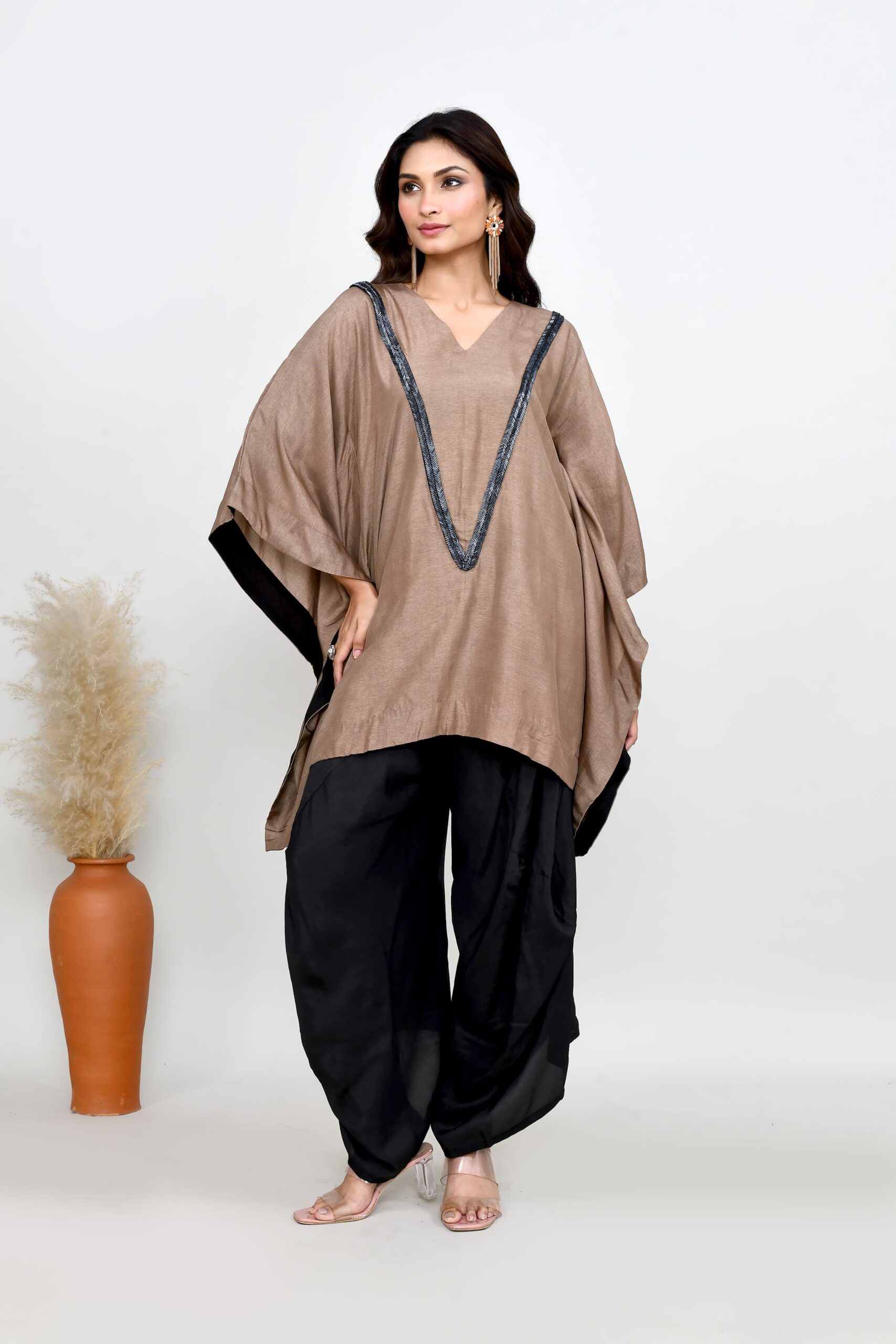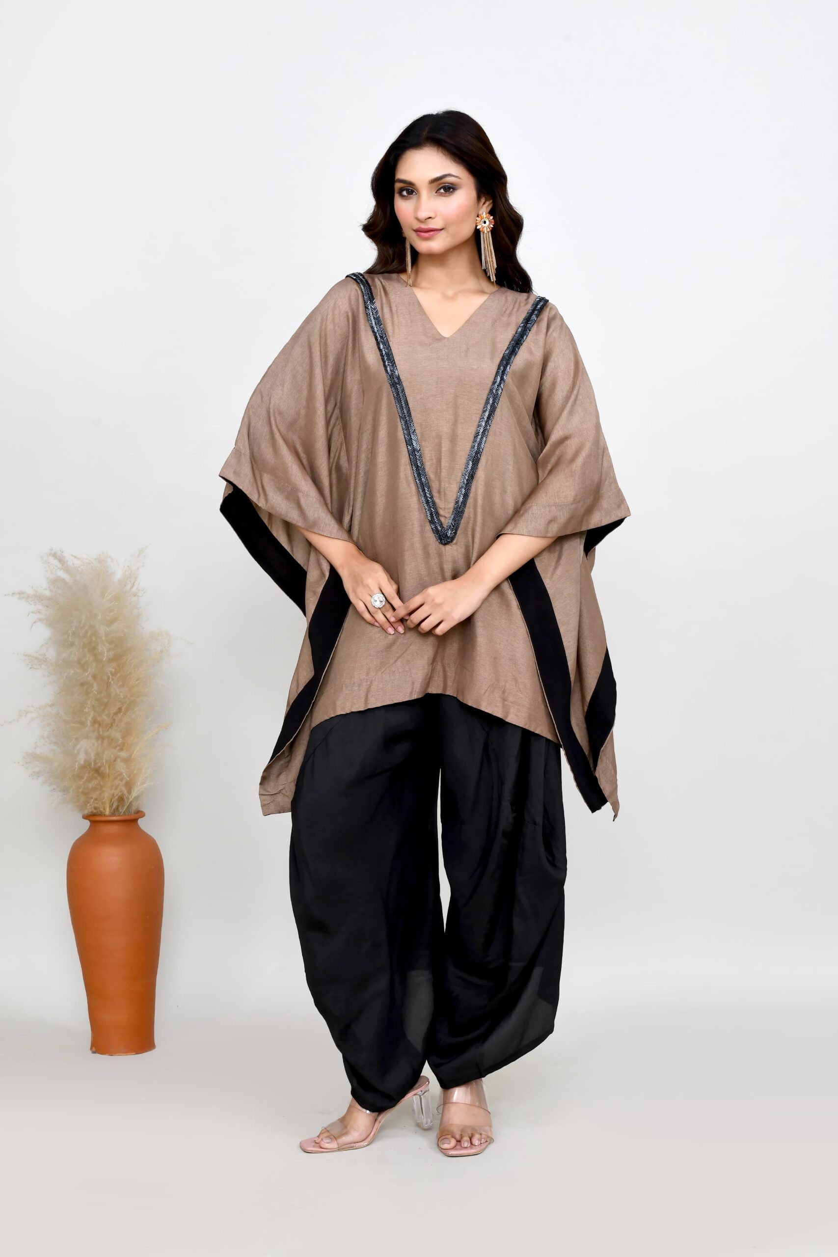 A dola silk kaftan with a hand detailed glass beads front and back hand embroidery. Color: Buff and Black Fabric: Dola Silk Size: nan