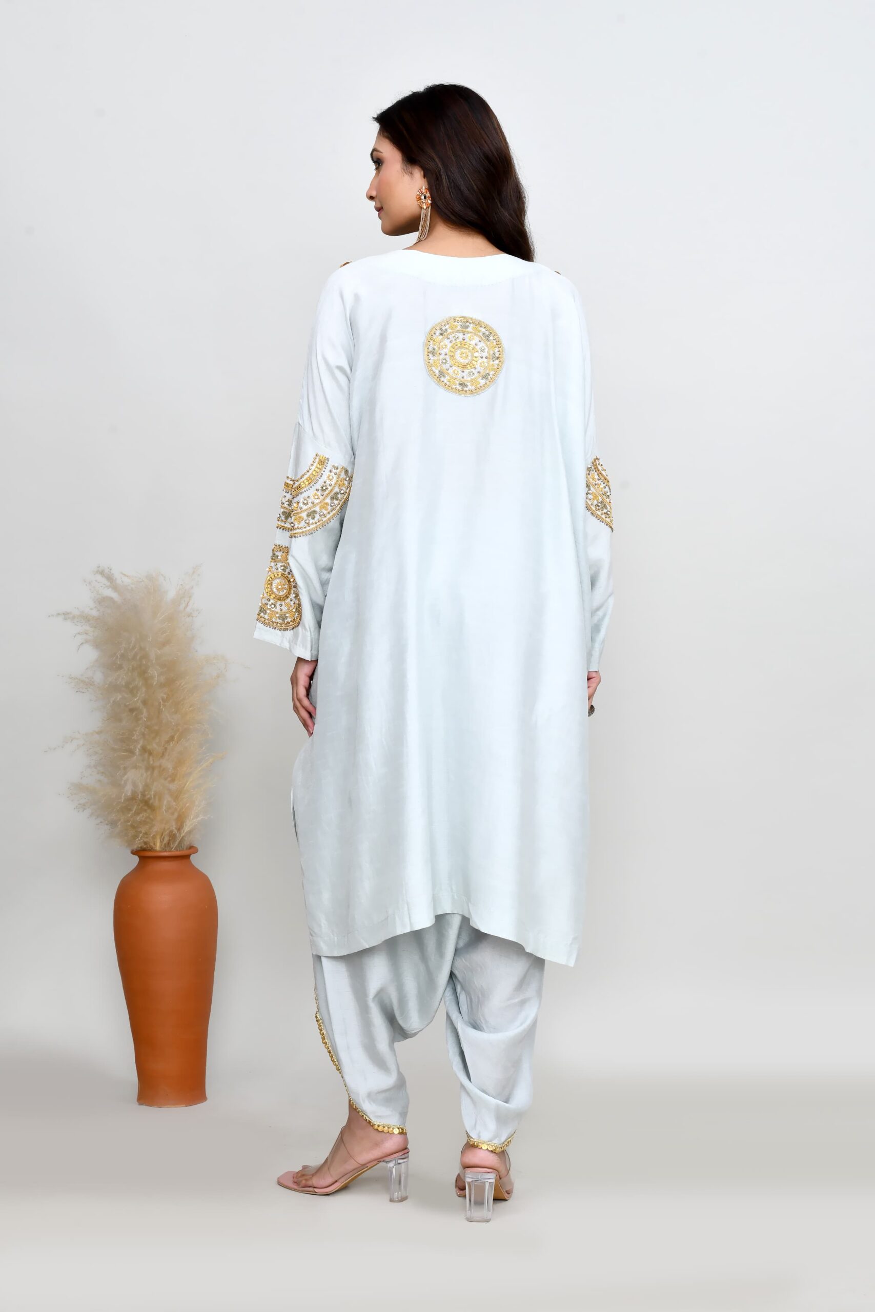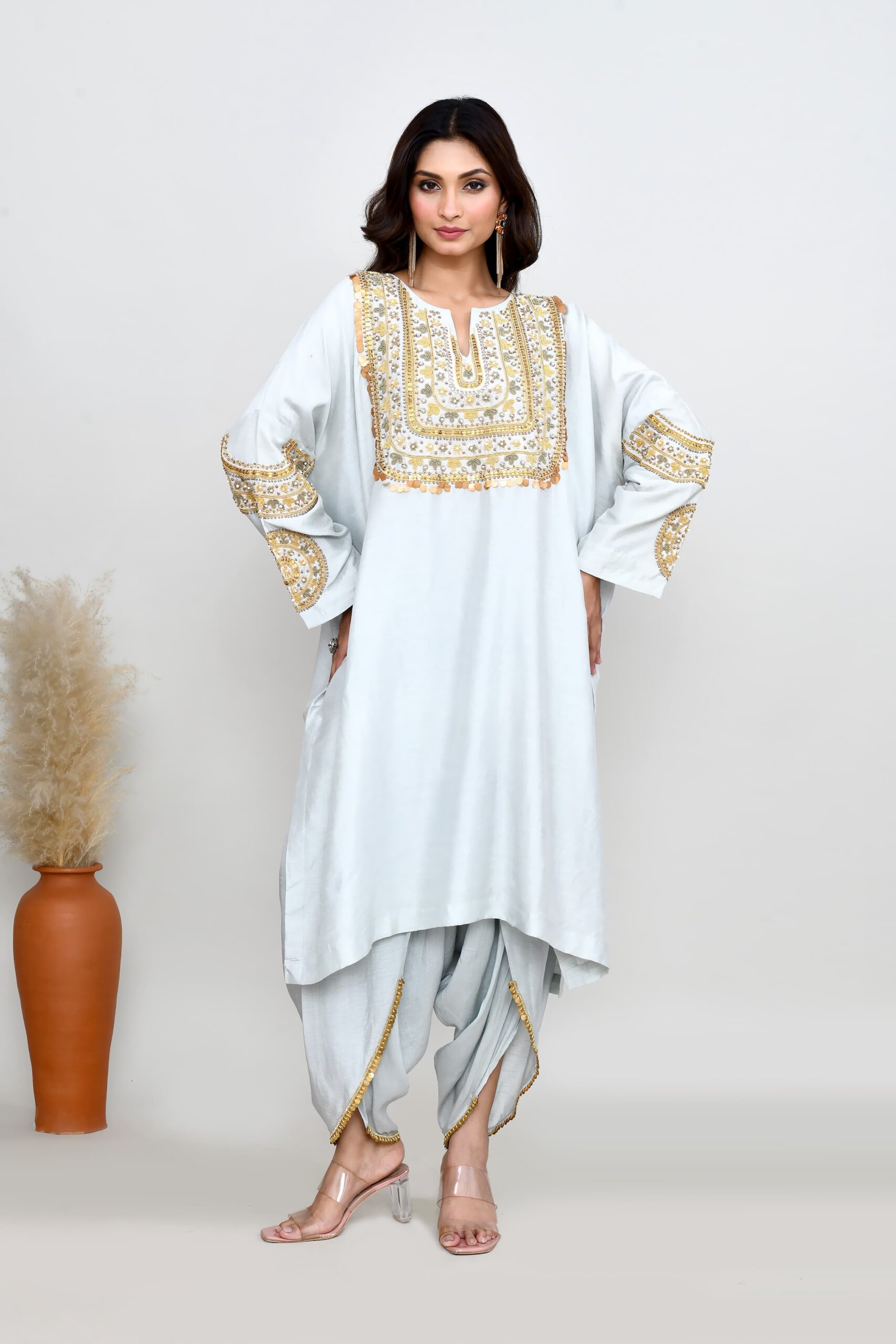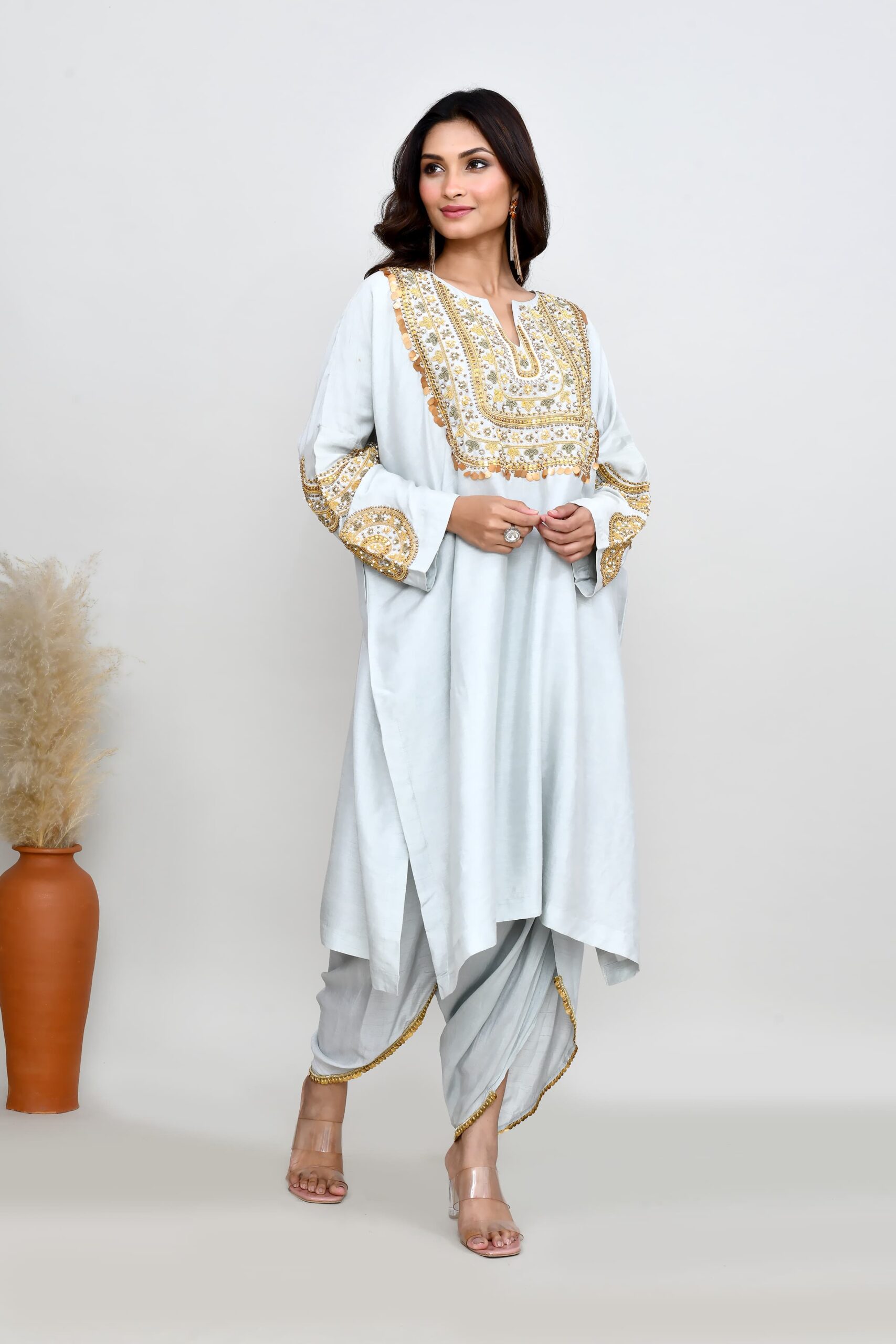 Intricately hand embroidered silk phiran top with tulip pants. Perfect fusion, indo western semi formal outfit for any festive or celebratory occassion.