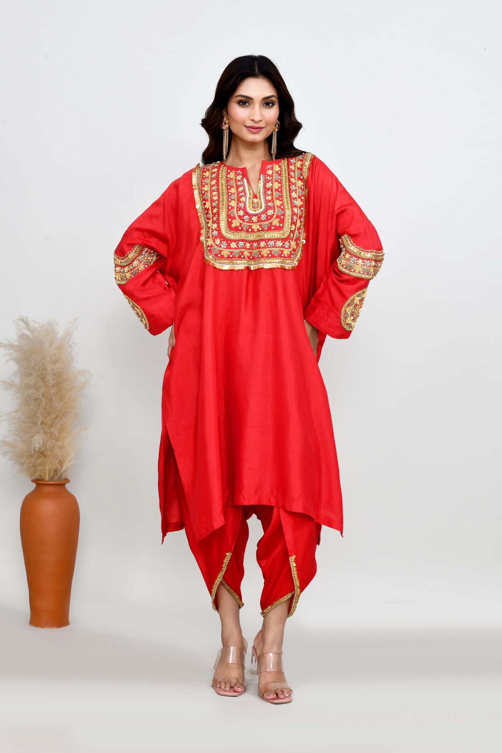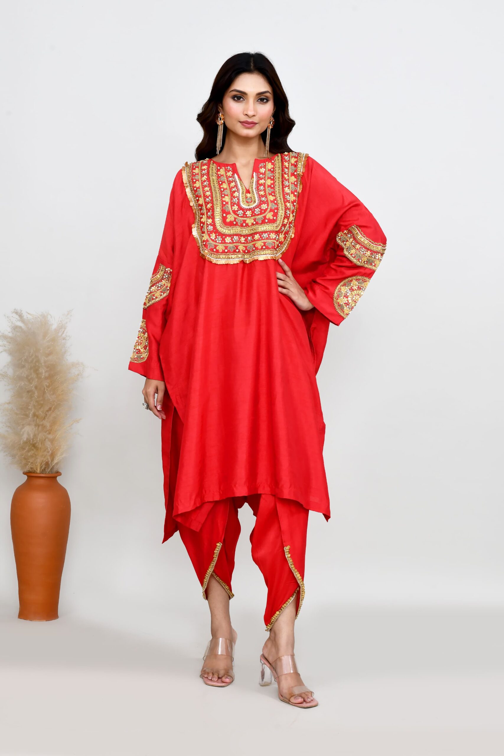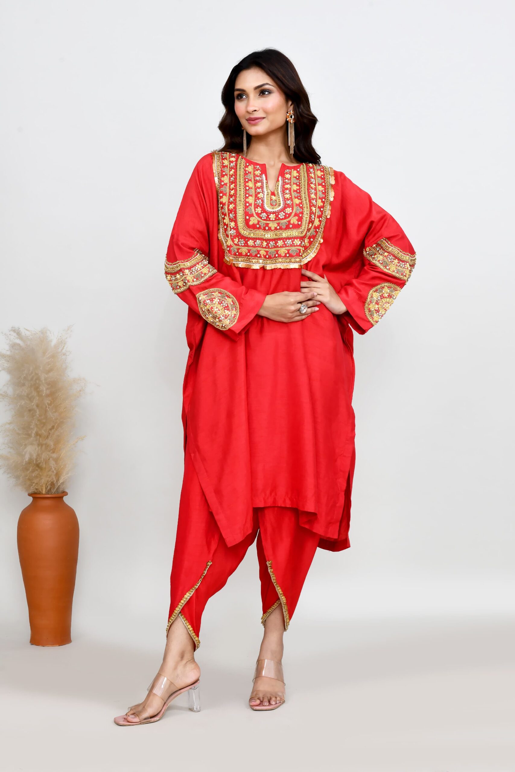 Intricately hand embroidered silk phiran top with tulip pants. Perfect fusion, indo western semi formal outfit for any festive or celebratory occassion.